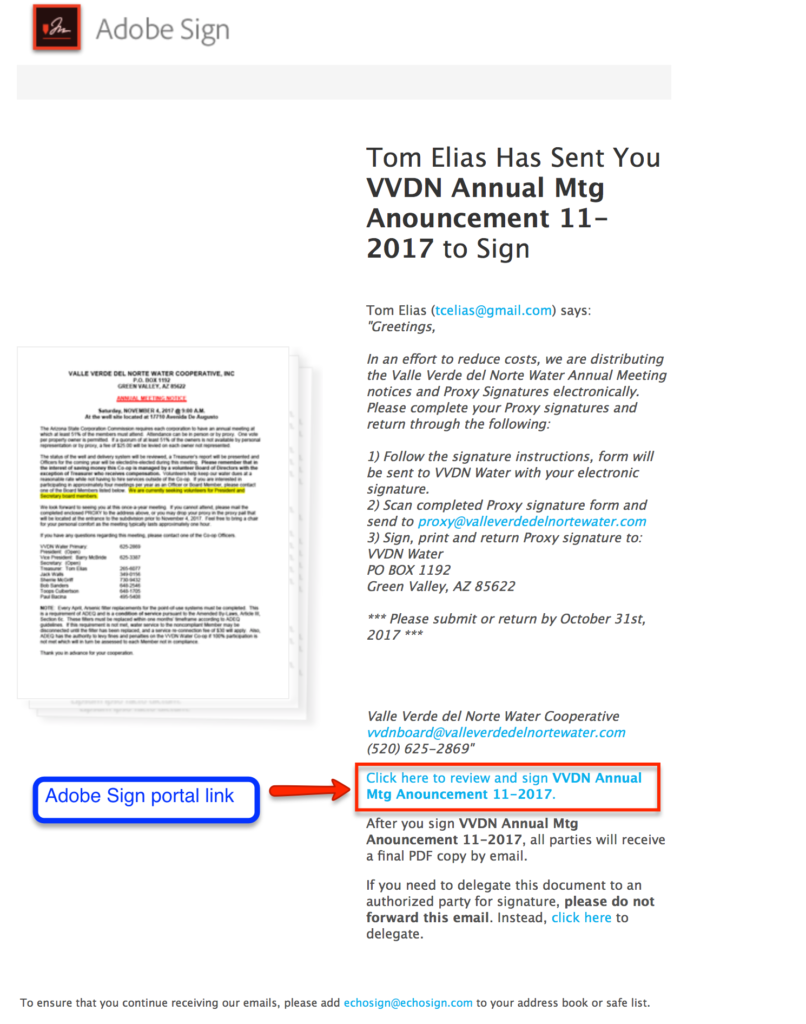 For those neighbors who have provided a valid email address, you will be receiving your Proxy form through email. The email will contain a link to the Adobe Sign portal where you can complete and sign your Proxy form.